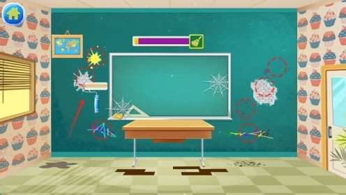 3、接下来进入教室清洁环节时,请继续按照箭头的指引,运用清洁工具对教室的损坏部位进行修复,然后点击相应选项完成清理操作。