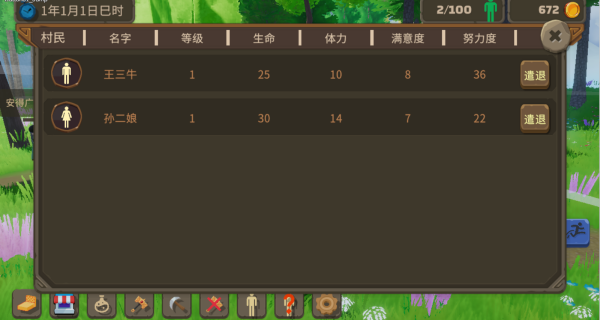 4、需留意村民的生命、体力、满意度与努力度这些属性,要借助提高满意度来维持较高的努力度,要是村民不符合当前的发展需求,能够选择将其遣退。