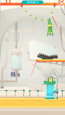 1、滑动屏幕切断箭头指向的线,使僵尸避开下方的陷阱,从安全区域降落,僵尸会自行走向离开的通道。