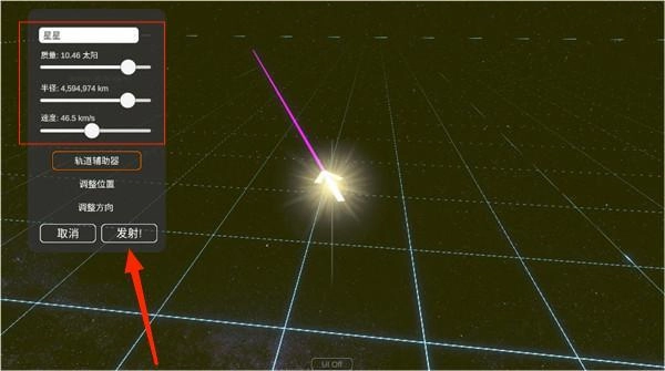 4、在确定好位置方向之后,接下来可以对球体的大小、自转速度以及质量等参数进行调整,待所有参数设置完成后,点击发射按钮即可。