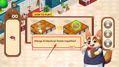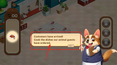 2、当狗狗顾客出现时,点击它头顶的订单,依据提示制作肉饼,做好后点击“Skip”按钮跳过对话。