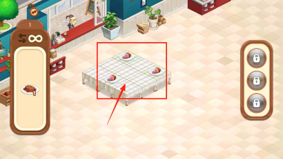 3、桌上的牛排数量不足时,点击左侧物品栏里的肉盘,接着点击桌子来补充菜品,要留意查看左上角的数字提示。