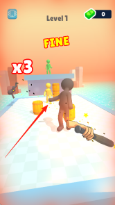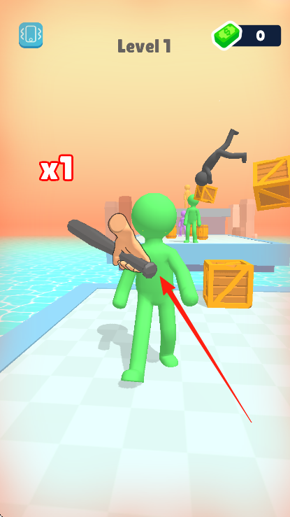 1、点击绿色小人使用棒球棍,触发攻击动作,留意界面显示的【Level1】关卡标识以及当前金币数量【0】。