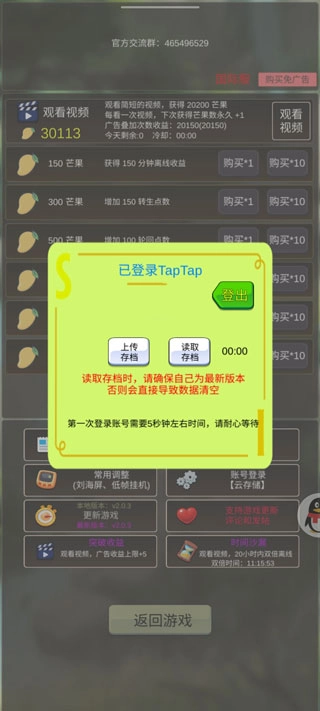 4、要是强化失败了,就读档回到之前的状态,这样强化等级就还是18级。读档功能有5分钟的冷却时间,在这段时间里可以去推推关卡之类的。等冷却时间过了能重新读档了,就继续保存上传再进行强化操作。
