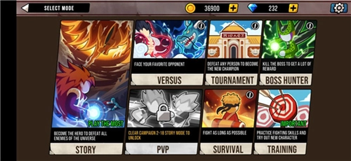 2、这里准备了丰富多样的玩法供玩家探索体验,像PVP模式、对战模式、故事模式、锦标赛模式、Boss猎人模式、训练模式等,其中部分玩法需要观看广告才能解锁或参与。