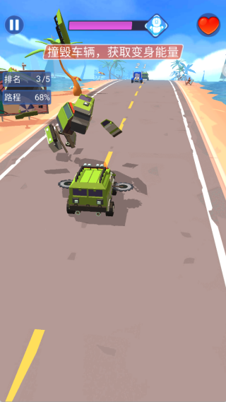 2、成功摧毁敌人的赛车可积累能量,能量充满后就能启用变形能力,使赛车切换为机甲形态,从而拥有更强的战斗力。