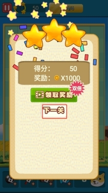 3、本关得分50,获得1000金币奖励,点击下一关按钮,即可进入难度更高的泡泡射击关卡,挑战全新布局。