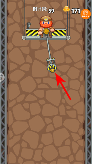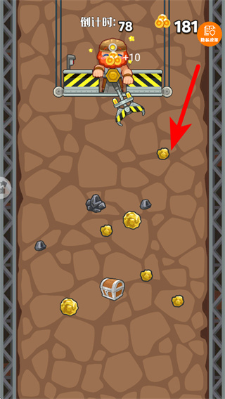 2、点击屏幕来操控挖矿爪下落,抓取地下的金块资源,以此积累关卡积分和奖励。