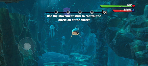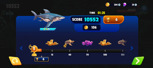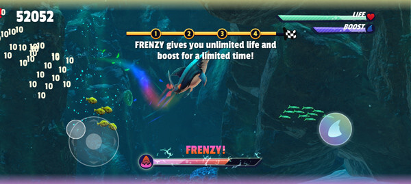 4.自由探索:完成新手教程后,就能畅快游玩了!控制鲨鱼随意捕食小鱼,等下方能量条填满时,会立刻获得超强加速度,帮助你拿到更多分数,朝着高分榜全力冲刺。