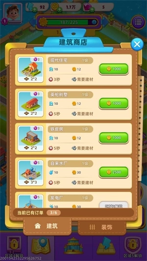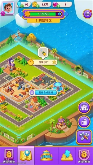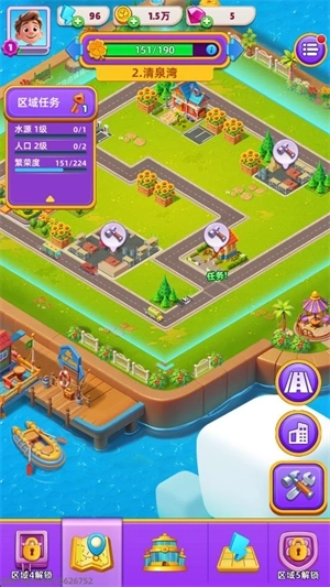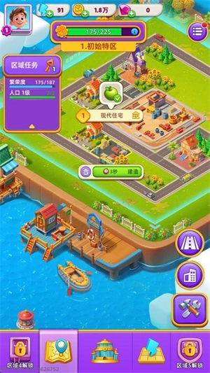 6、游戏里有不同的区域等你去建造,每个区域都有不同的任务,完成上一个区域的任务才会解锁下个区域。