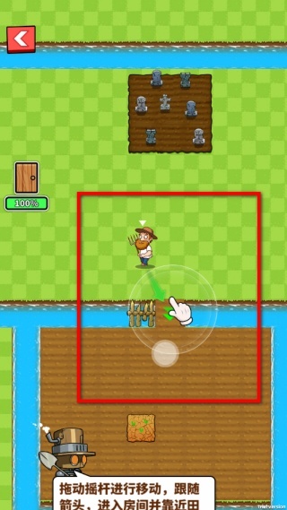 1、拖动摇杆来操控角色移动,按照箭头的指引进入房间并靠近田地,这是开启后续操作的前提,完成这一步后就能进行田地相关的建设工作了。
