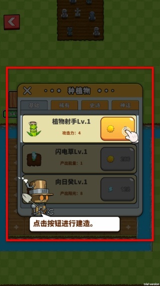 3、进入种植界面后,可挑选植物射手、闪电草等不同类型的植物,消耗相应资源并点击按钮完成种植;这些植物具备攻击能力或能产出资源。