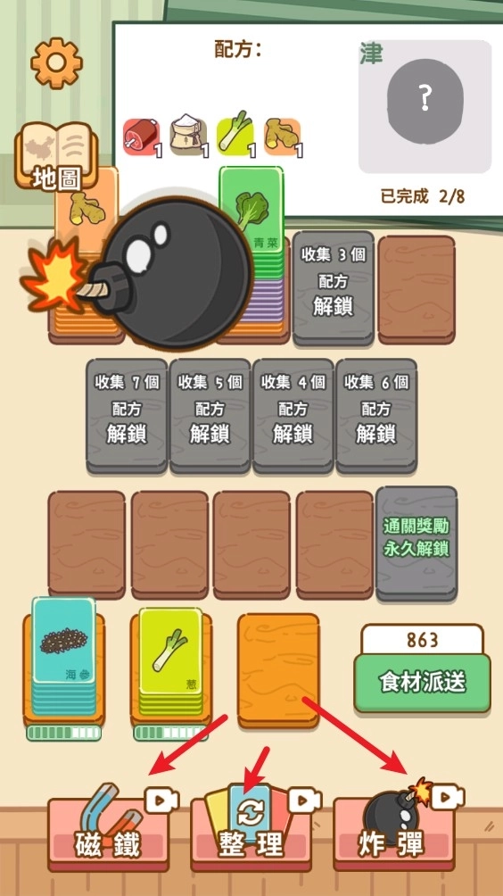 3、所有的食材都可以直接移动到下方的案板上,但是后续就无法移动,除非凑齐到10个合成出食材。