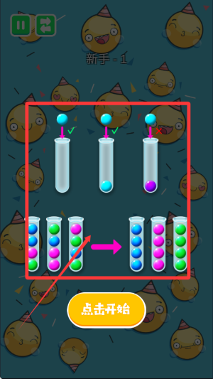 4、该游戏的核心目标是将所有同类型的表情符号归置到同一个试管里,只要顺利达成此目标,就能通关并解锁下一个关卡。
