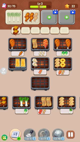 进入游戏后,将注意力集中在烧烤台上,通过点击三个相同的烤串来完成消除操作,这样会触发新烤串的刷新,从而推动关卡进度的前进。