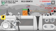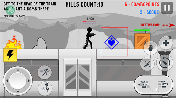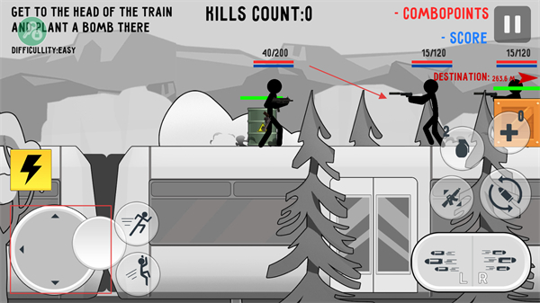 1、借助屏幕左侧的虚拟摇杆,能够操控火柴人在火车等场景里移动,可实现前进、后退或转向,从而靠近敌人或者避开危险。