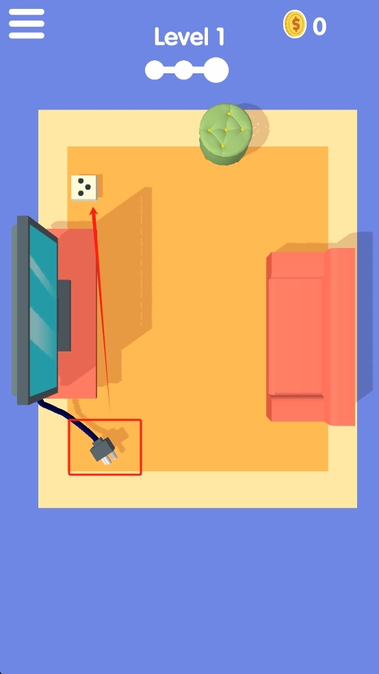 1、仔细观察所处场景,定位到红色框标注的插头,沿着红色指引线的走向,将该插头拖动到与之匹配的插座处,操作过程中要留意避开家具等障碍物。