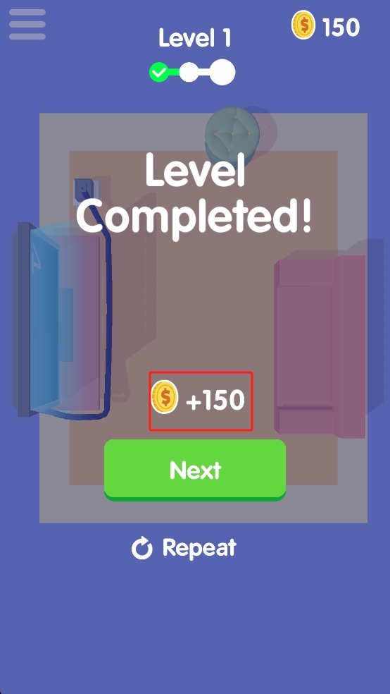 3、成功通过关卡后可获得150金币,点击绿色的Next按钮就能进入下一关,继续挑战新的插头连接任务。