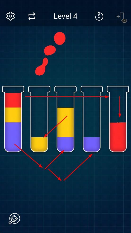 3、继续进行操作,把所有试管里的液体依据颜色统一归类,满足关卡规定,实现分类目的。
