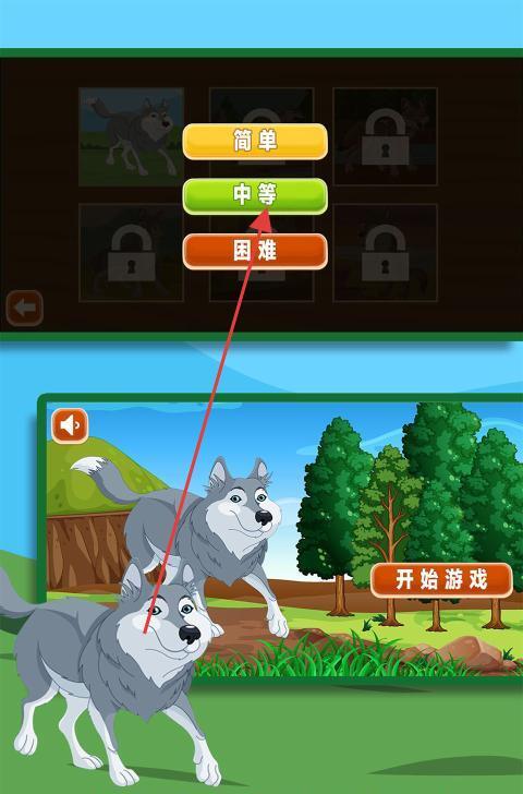 1、打开游戏,挑选难度(简单/中等/困难),开启以狼为主题的拼图挑战。