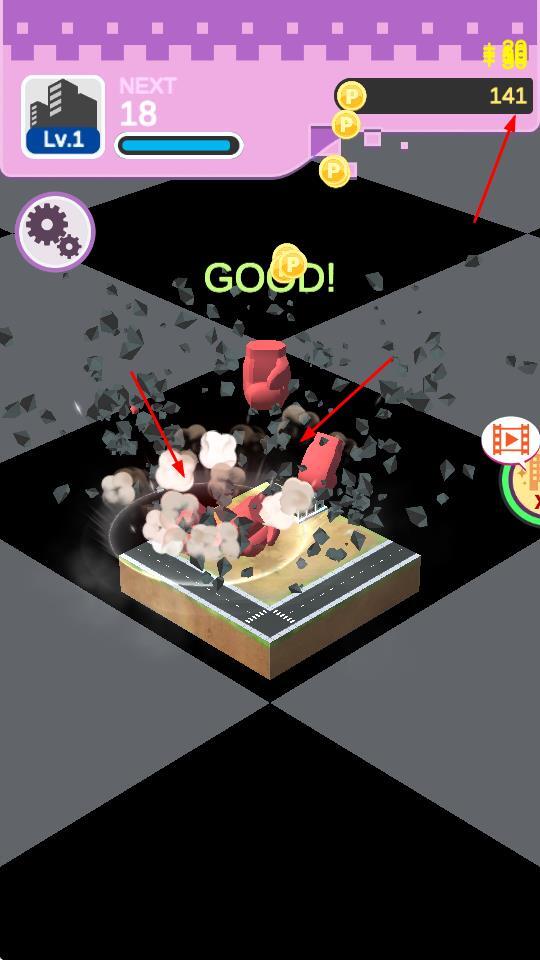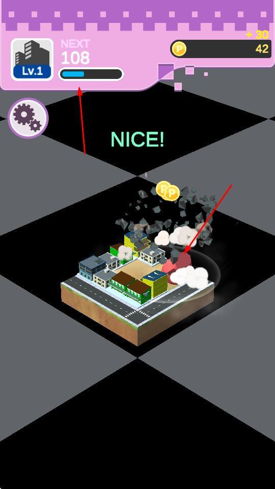 1、“城市摧毁”玩法:在游戏界面点击城市模型,即可触发摧毁效果,同时获取金币(金币数额依次为42、141、514),以此推进游戏进度。