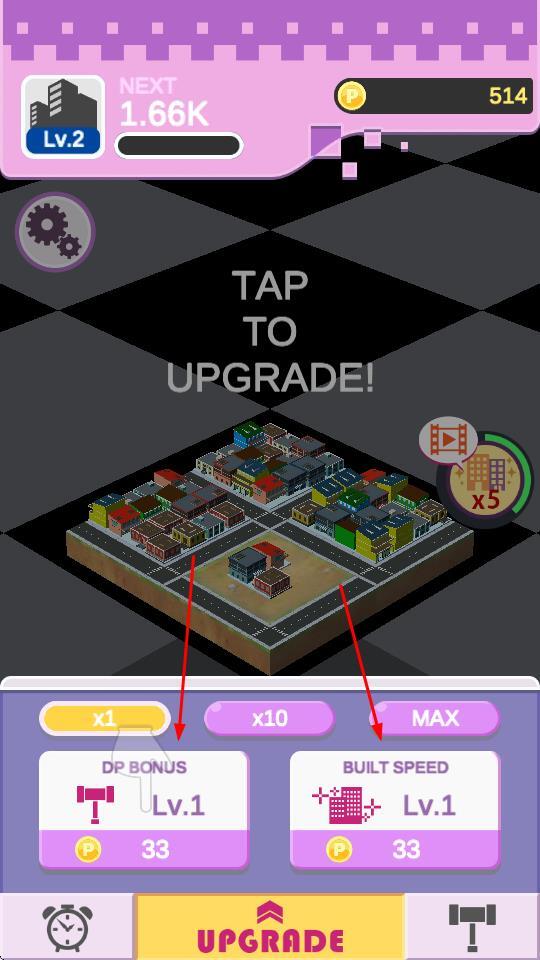 3、“建筑升级”操作:点击“UPGRADE”按钮后,从升级选项中选择DPBONUS或BUILTSPEED。