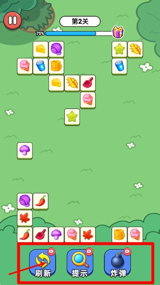 1.游戏界面下方的功能栏设有“刷新”“提示”“炸弹”等道具按钮,合理使用这些道具能够帮助玩家提高通关效率,或是有效打破当前的卡顿局面。