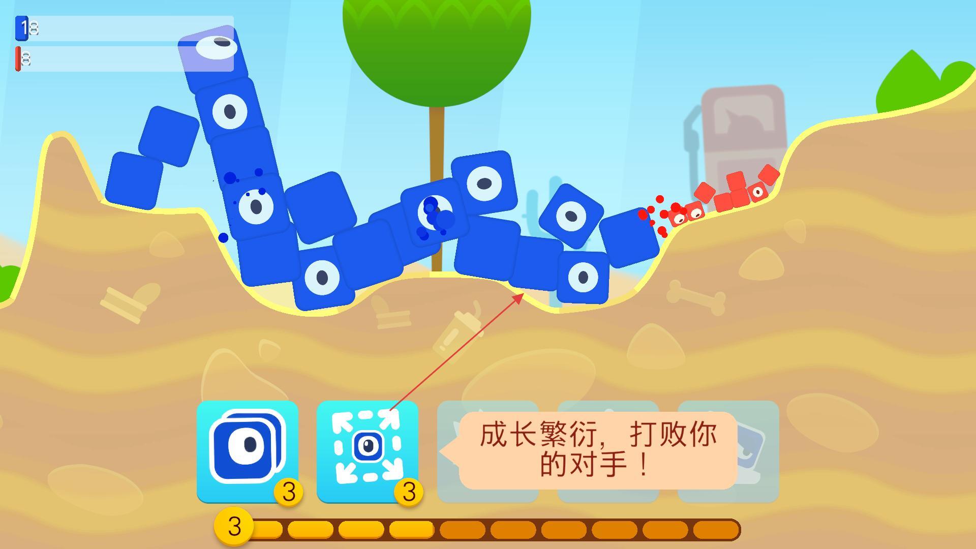3、依靠持续的成长与繁衍来扩充自身规模,随后向红色对手发起吞噬与攻击,凭借数量累积和成长速度的双重优势在竞争中取得领先地位。