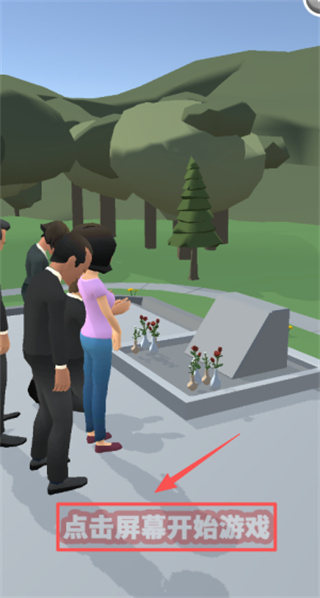 2、进入3D墓碑场景后,点击底部红色框内的“点击屏幕开始游戏”提示框,按箭头方向确认开始。