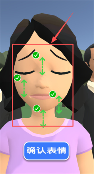 3、当面对皱眉的女性角色时,请按照绿色箭头与圆圈的提示来挑选对应的表情,随后点击下方蓝色的“确认表情”按钮进行提交。