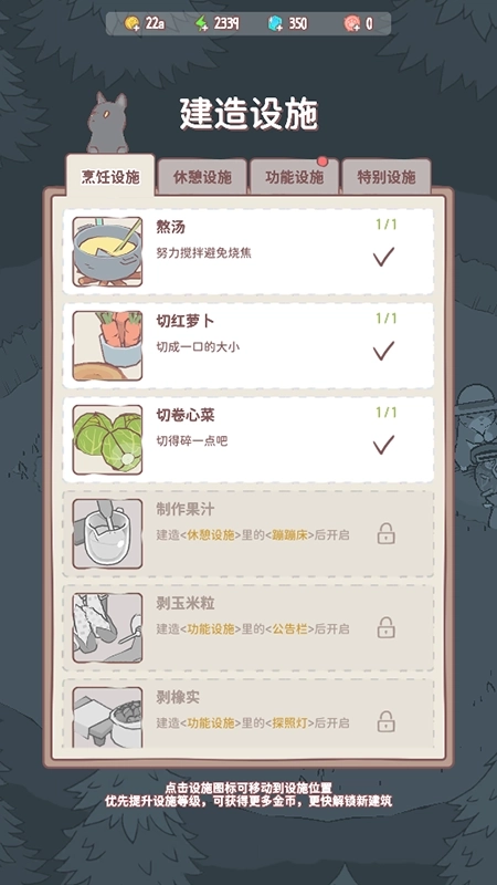 3、设施升级策略:结合收益情况与实际需求开展设施升级工作。优先对金币收益高、美食制作耗时短的摊位进行升级,特别是已解锁高利润美食配方的摊位。至于游乐设施和休憩设施,需依据猫咪的数量及实际需求来升级,确保猫咪拥有充足的娱乐与休息空间。