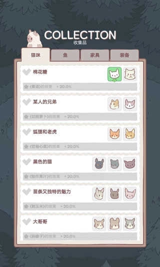 6、在收集图鉴中,你能够查看已收集到的猫咪品种、鱼类图鉴、家居摆设以及装饰配件。