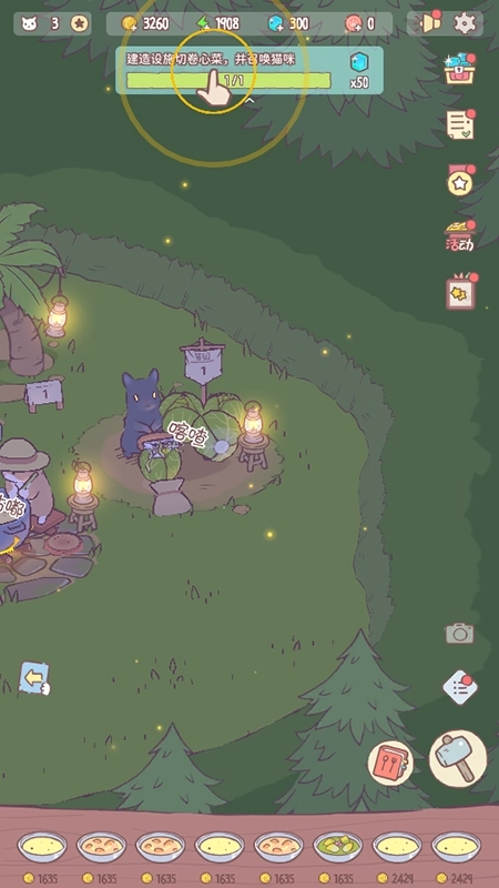 3、美食制作与售卖:指挥猫咪进行美食制作,制作过程中会有真实的音效,像料理时的咔嚓咔嚓、咕嘟咕嘟声。制作好后可以卖给其他猫咪,赚取金币。这些金币能用来修建新设施、购置装饰物品等,助力猫村的发展。