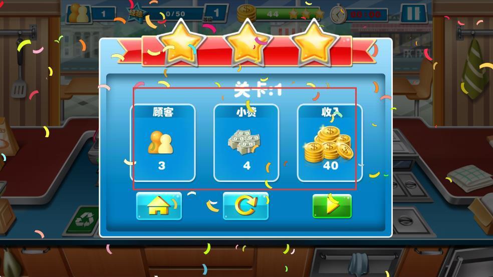 3、在规定时间内顺利完成所有订单就能通关,系统会根据评分来解锁新的关卡和厨具。