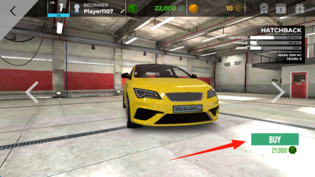 1、在车库界面,点击绿色BUY按钮,花费21,000绿色货币购买黄色HATCHBACK汽车。