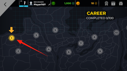 2、打开地图界面后,找到标有数字“1”的黄色圆形关卡并点击选择,以此开启职业生涯的首个驾驶任务。