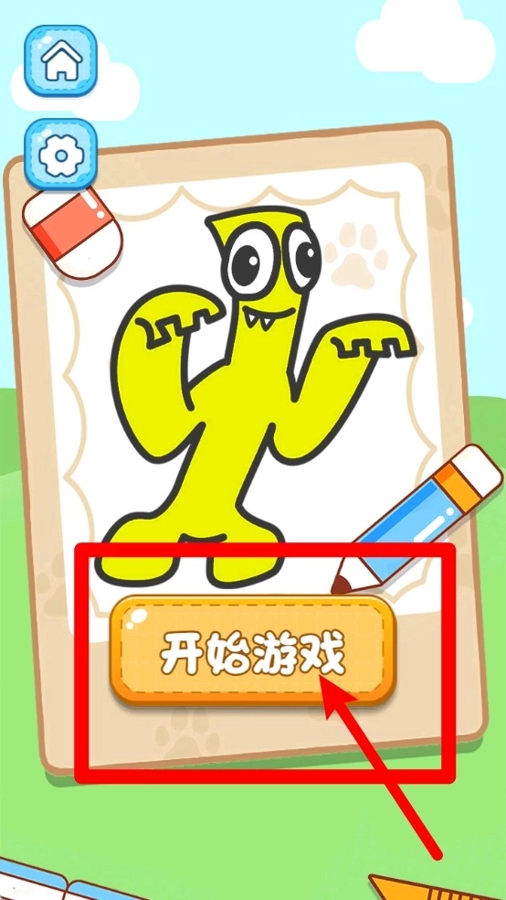 1.初始界面:中央区域呈现示例作品,点击下方的“开始游戏”按钮就能进入涂色环节,左侧设有主页和设置按钮,便于用户快速切换操作。
