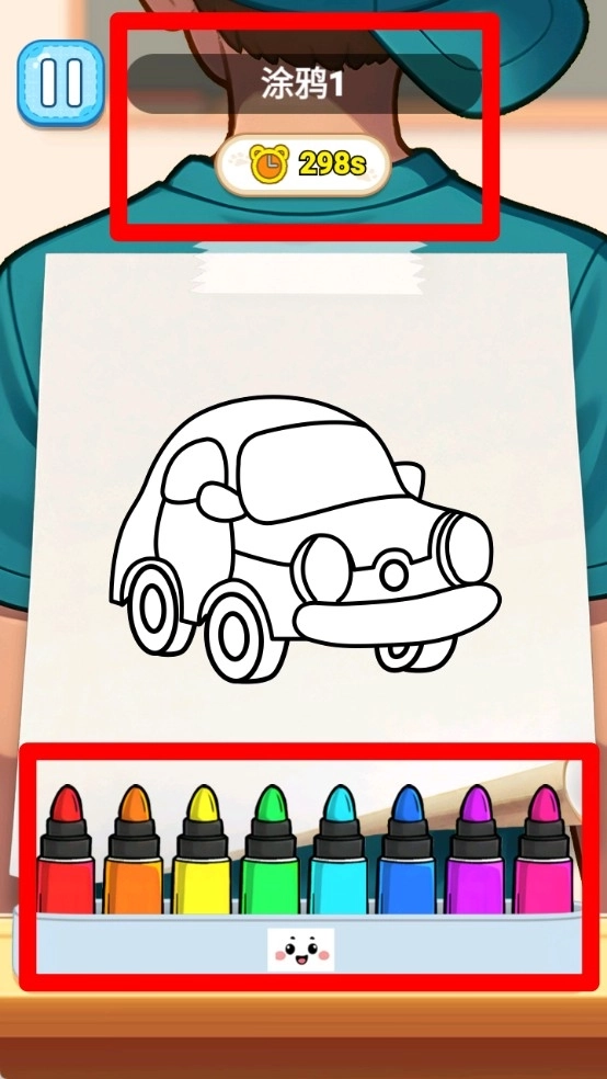 3.涂色界面布局如下:顶部区域展示当前关卡信息与倒计时,左侧设有暂停功能按钮,界面中部呈现待上色的小汽车线稿,下方的彩笔选择栏可供用户挑选颜色后点击对应区域完成涂色操作。
