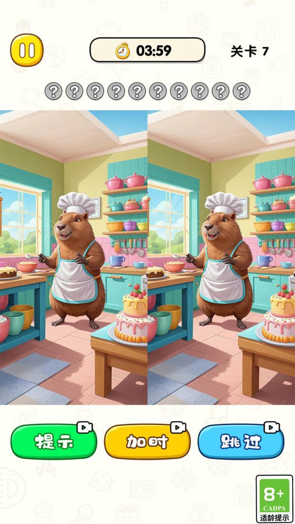 3、遇到阻碍时可以借助辅助功能,要是找不到差异或者时间不够用,就能通过提示、加时或者跳过按钮来帮助自己完成关卡。