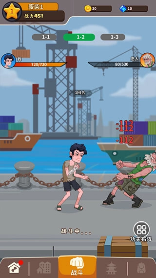 2、在角色头顶处,敌我双方的血条清晰可见,界面顶部还会显示当前所处的关卡回合。角色会自动进行战斗,左上角能看到自身的战力等级,当等级达到特定要求时,还可以参与右下角的功夫布阵玩法。