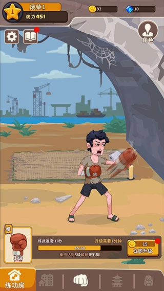 1、摆脱废柴身份后,打开应用进入,点击底部的“拳头”图标开始战斗。