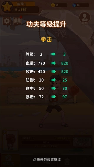 6、每次升级都能增加自身的生命值、攻击力、防御力、命中率和暴击伤害,随着实力逐渐提升,就能挑战更多的boss了。