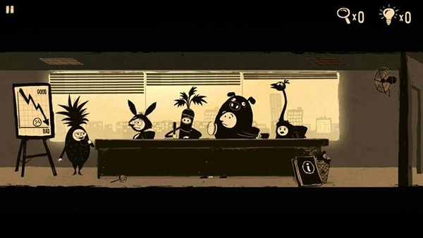 4、用鸵鸟头取下上方损坏的灯罩,接着用之前获得的灯泡完成修复。前往第一个场景捕捉一只苍蝇,再回到第二个场景,先点击风扇两次,再点击空中的风一次释放苍蝇,之后再次点击风扇,就能把苍蝇吹向女主管。女主管开枪扫射时会掉落笔和叶子,此时返回第一个场景,用棒棒糖和叶子制作一杯爱心咖啡递给女主管,趁机修改牌子上的业绩,即可顺利通关。