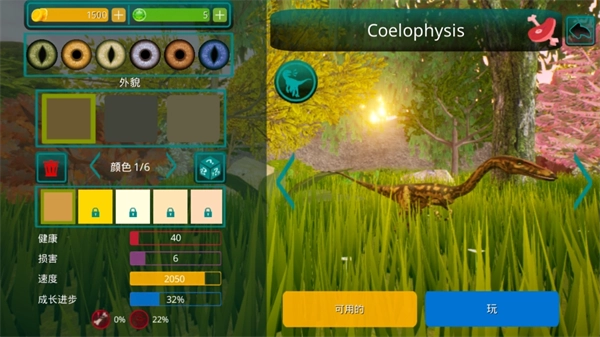 3、自定义装扮系统,打造专属恐龙形象,左侧可编辑各类外貌与颜色