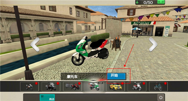1、在本站完成安装后,点击打开进入游戏,此时会有一辆小摩托可供直接使用,我们点击“开始”即可。