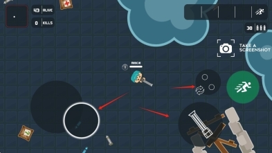 1、进入游戏场景后,操控角色进行移动,借助右侧按键来调整武器和控制移动方向,主动靠近黑色区域这类资源点,拾取各类物资以武装自身。