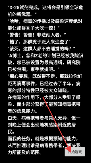 1、先阅读开场剧情,了解当前的病毒危机背景以及角色需要完成的任务——推理出谁是病毒携带者,随后点击“开始游戏”按钮,进入注册或登录的流程。