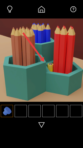 2、要先查看物品栏中已选中的蓝色把手,接着点击桌面上铅笔筒的间隙处,以此来获取隐藏在那里的黄色电池。