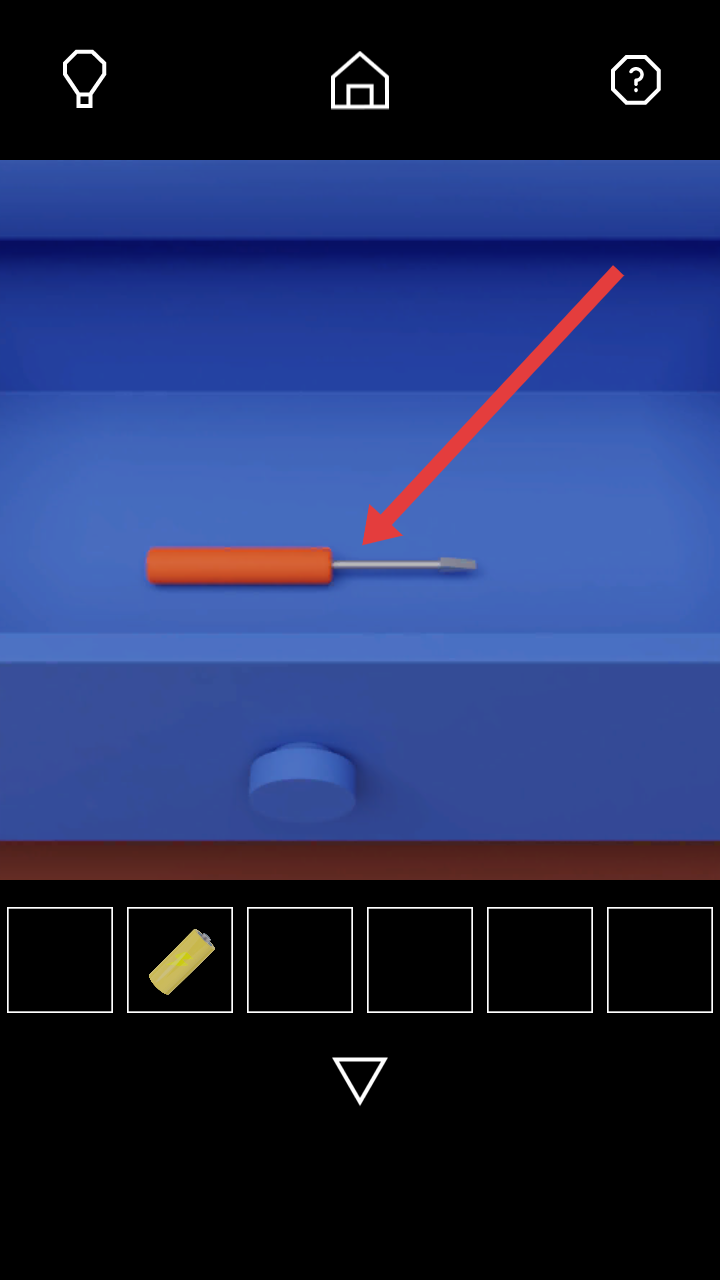 3、收集黄色电池后,继续探索踢脚线区域,把蓝色把手安装到抽屉上,打开抽屉后拾取橙色手柄的螺丝刀道具。