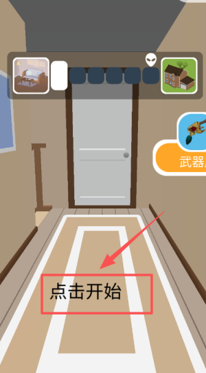 1、进入游戏后,看到走廊样式的游戏界面,点击下方红框标注的“开始”按钮(旁边配有红箭头提示),即可启动寻找外星人的游戏。